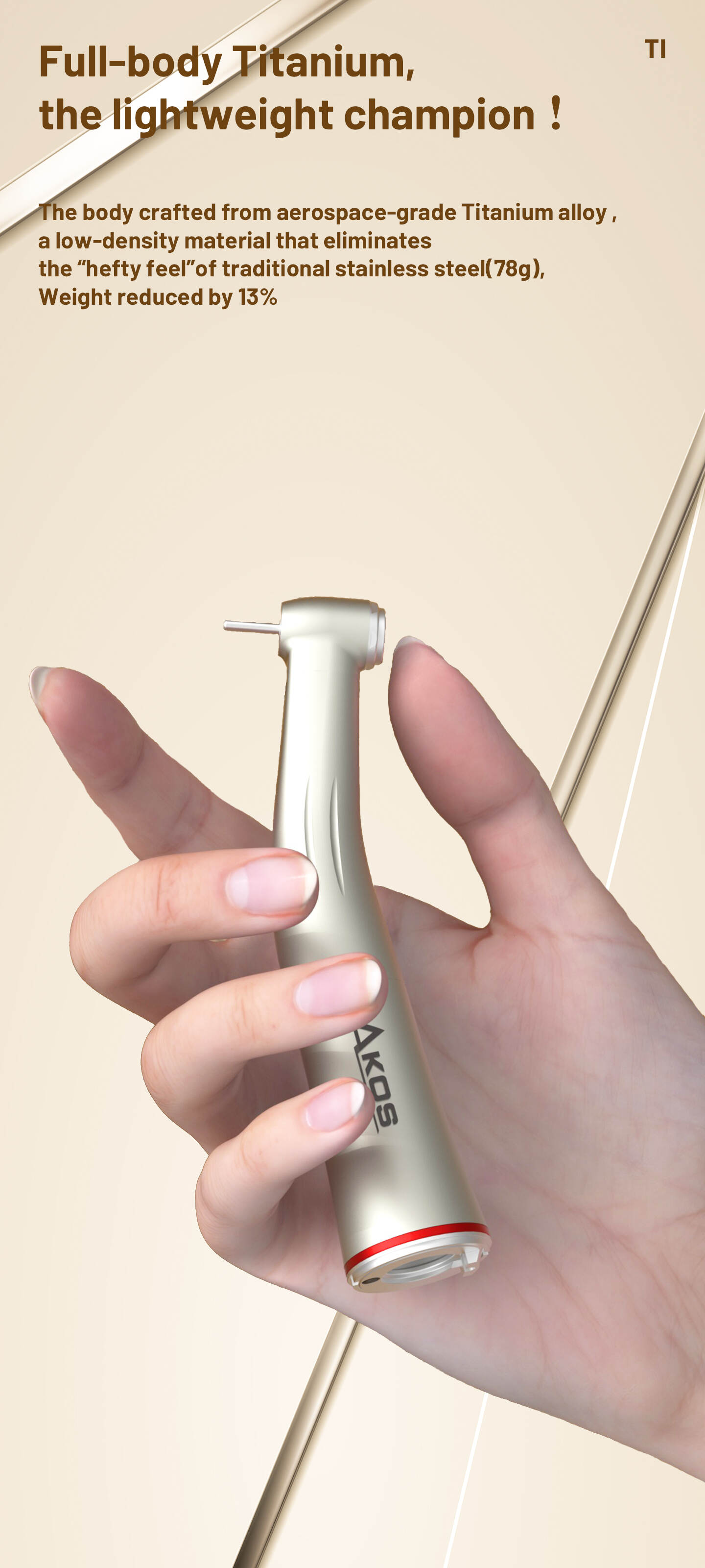 AKOS's product line includes high-torque high speed handpiece, precisely controlled low speed handpiece, contra angles with most ratio, motors, and precision accessories. Among them, the Titanium 1:5 Increasing Contra Angle is praised as the precise "scalpel" in dentists' hands, demonstrating outstanding performance in clinical practice. Building upon the superior qualities of the original Stainless Steel 1:5 Increasing Contra Angle, this product has achieved multiple upgrades: